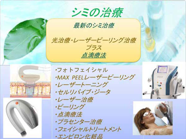 ワンランク上の『しみ・しわ・たるみ・くすみ』などの治療は『セルリバイブ・ジータ』などの皮膚再生若返り治療や『フォトフェイシャル』・赤外線レーザーによって、メラニン色素を消去したり、線維芽細胞を刺激して、コラーゲン線維の生産を促し、『美白点滴治療』を同時にまた、複合的(施術・点滴時間30~40分)に行って、個々のお肌のトラブル、悩み、ニーズにお応えします。