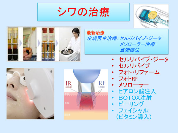 目の周囲やほうれい線のしわたるみの若返り治療は、従来の『フォトフェイシャル』や『ヒアルロン酸注入』や『ボトックス注射による治療方法』を行いましたが、最近は40分の1回施術で2~3年間持続する『セルリバイブ・ジータ という細胞再生若返り治療』が効果的です。