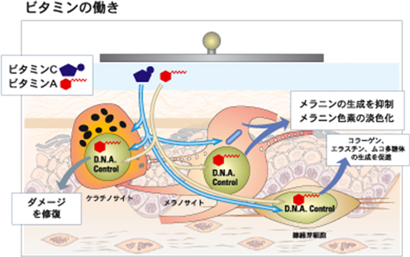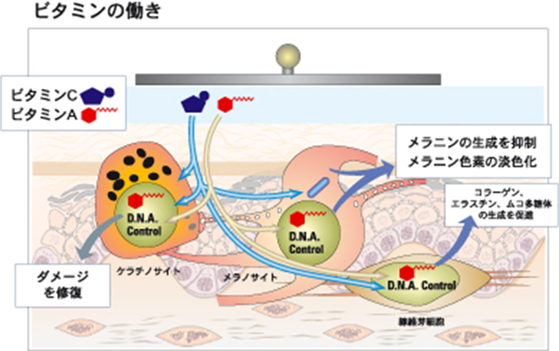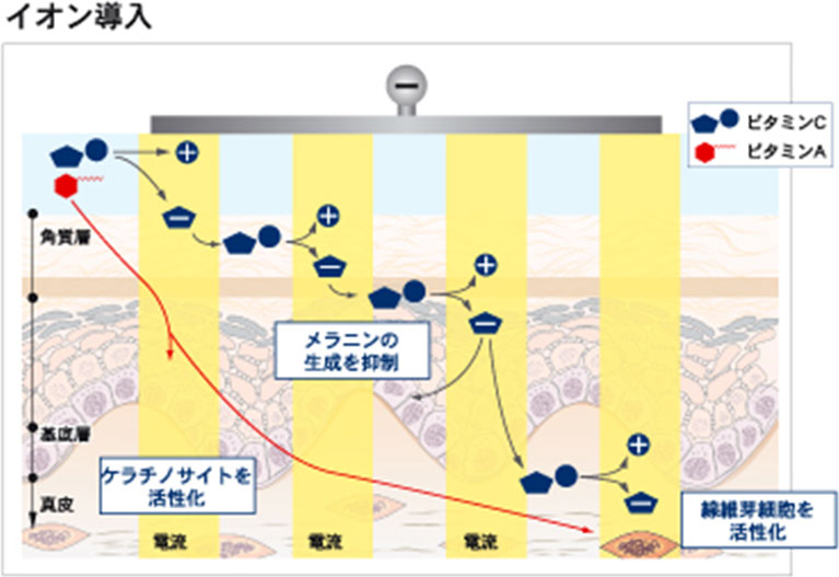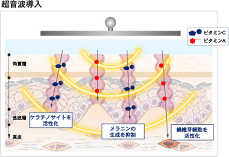 ソノフォレーシス(ソノフォイオントリートメント) ビタミンAやCを超音波導入とイオン導入を用いて、効果的に皮膚の深部へ浸透させます。2つの導入を同時に施術することが可能です。 詳細はこちら 超音波の物理的な振動を与えることで、皮膚にキャビテーション(空洞化現象)を起こし、分子を皮膚の深部にまで浸透させることができます。 マイナス極からの電流を断続的に流すことで、プラスイオンは皮膚の表面に引き寄せられ、マイナスイオンは反発して皮膚の深部に送り込まれます。また、皮膚に電気的な刺激を与えることで、イオン化しにくい分子の浸透も促進されます。 ビタミンAの働き ○皮膚細胞を活性化 ○ダメージを受けた皮膚細胞の機能を正常化 ・細胞の成長を正しくコントロール ・皮膚の免疫機能を向上 ビタミンCの働き ○皮膚細胞を活性化 ○色素形成を抑制 ・メラニンの生成を抑制 ・メラニン色素の淡色化 ページトップへ戻る