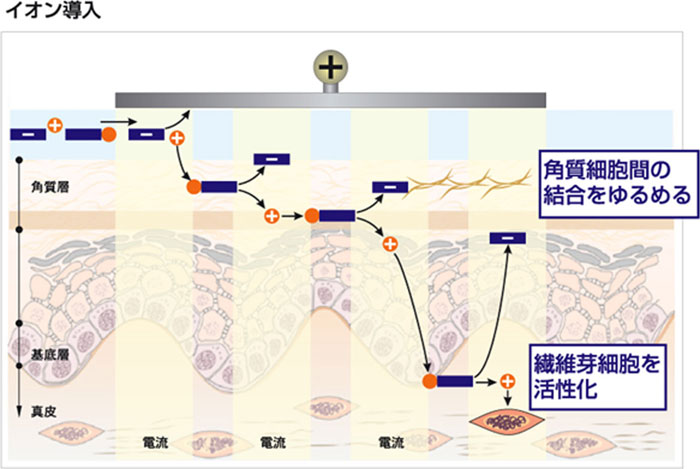 乳酸ピーリングイオン導入(ラックトリートメント) AHAの働きにより、角質細胞間の結合をゆるめ、角質のごく表層にマイルドなピーリング効果を与えます。イオン導入を行うことで、皮膚のバリア機能にダメージを与えず、皮膚細胞の活性化を促進させることができます。 詳細はこちら プラス極からの電流を断続的に流すことで、マイナスイオンは皮膚の表面に引き寄せられ、プラスイオンは反発して皮膚の深部に送り込まれます。